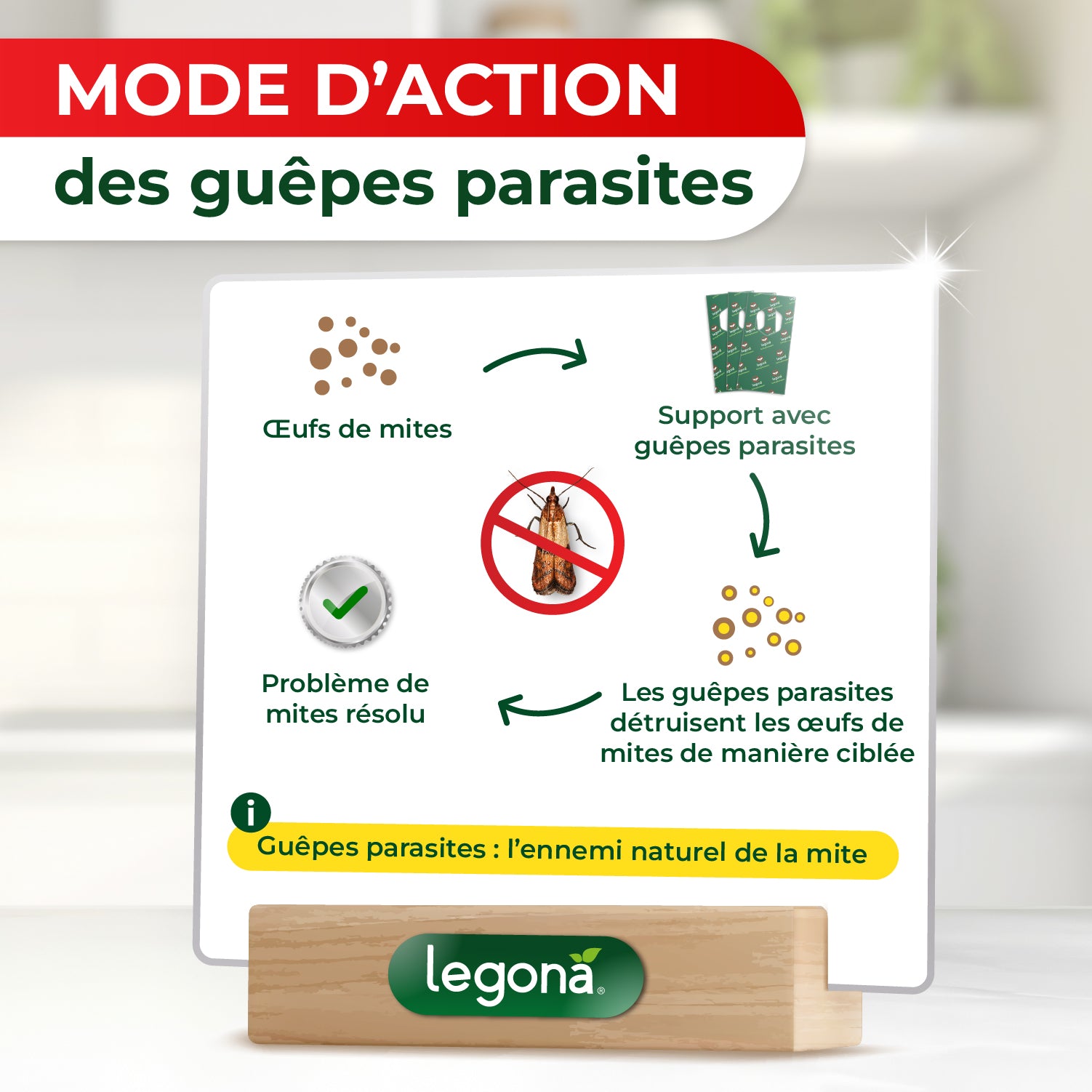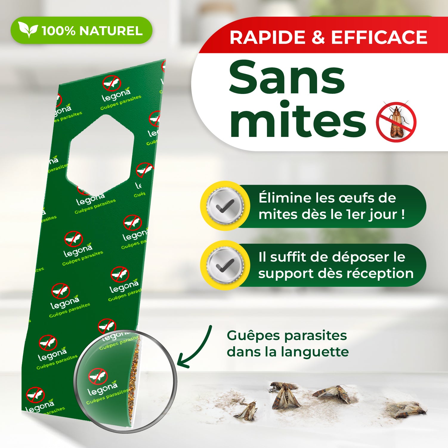 Les guêpes ichneumon de l'espèce Trichogramma evanescens également appelées trichogrammes s’avèrent être le produit anti mites alimentaires dont il vous faut. Le trichogramme est un insecte minuscule, mais efficace ; il mesure à peine 0,4 mm. Cet insecte inoffensif pour l’humain utilise son odorat fin afin de traquer les œufs des mites alimentaires. Ensuite, il pond ses œufs à l’intérieur de ceux des mites alimentaires pour y faire vivre ses propres larves et exterminer graduellement la larve de la mite alimentaire. C’est de cette manière que la Trichogramma evanescens interrompt de manière fiable le cycle de reproduction des mites des aliments et des mites des vêtements dans votre maison. Pour des résultats définitifs contre les mites - sans risque!