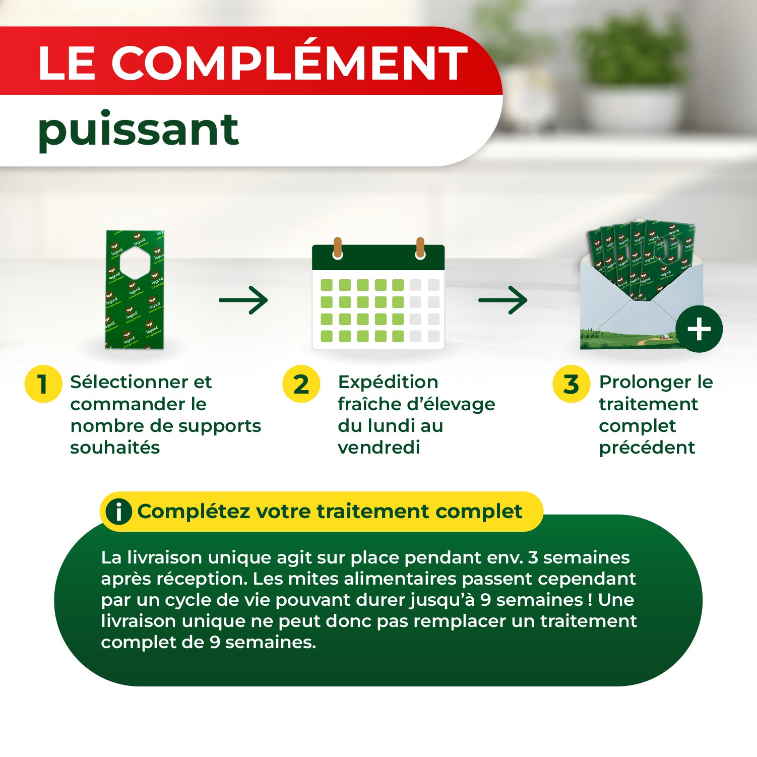 Vous avez déjà suivi le traitement de 9 semaines contre les mites alimentaires et vous voulez être sûr d’en avoir réellement fini avec les mites alimentaires ? Aucun problème!
