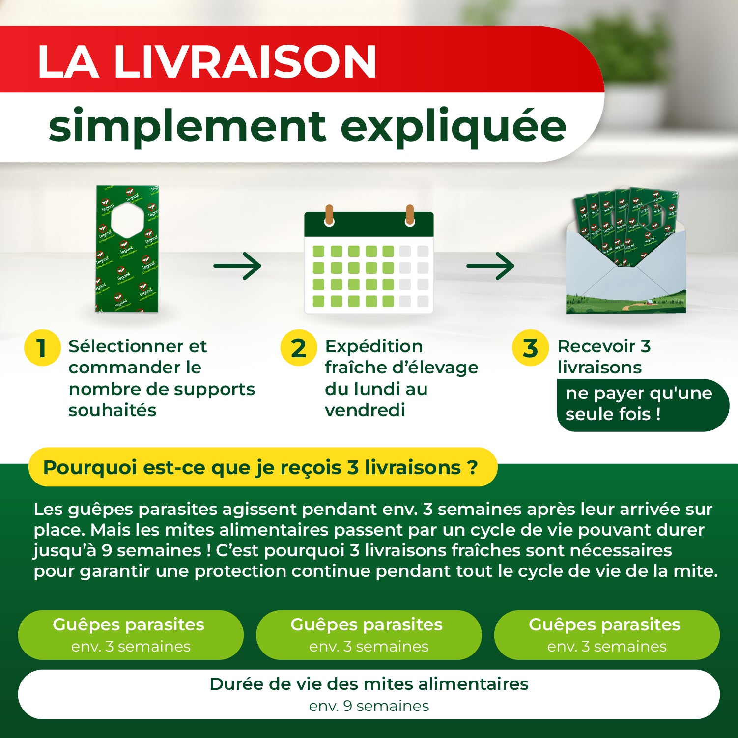 Le traitement comprend 3 livraisons automatiques. Chaque colis contient des trichogrammes fraîchement récoltés. Les trichogrammes contenus dans les trois envois ont un décalage de trois semaines dans leur développement. Vous pouvez modifier les dates de livraison sur demande préalable.