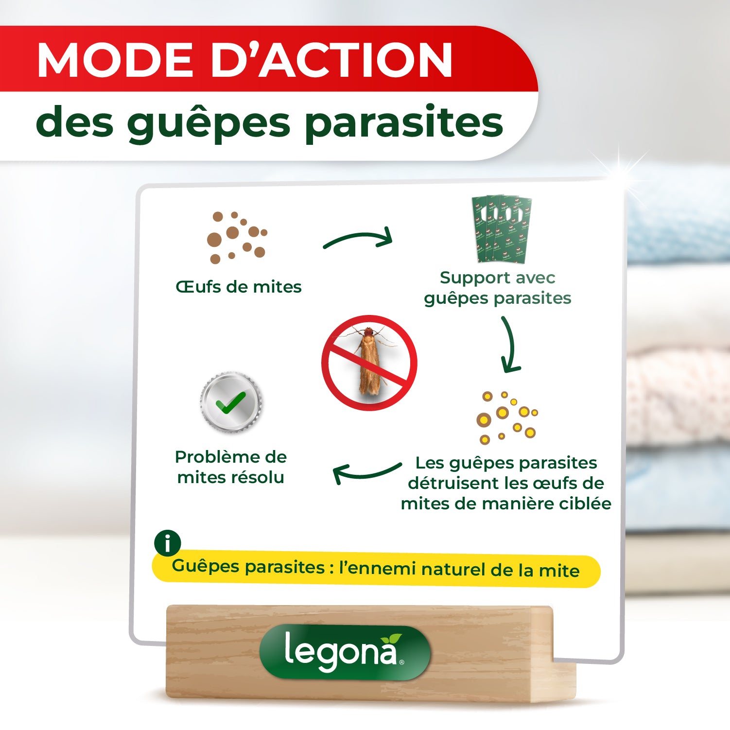Cet insecte inoffensif pour l’humain utilise son odorat fin afin de traquer les œufs des mites de vêtements. Ensuite, il pond ses œufs à l’intérieur de ceux des mites textiles pour y faire vivre ses propres larves et exterminer graduellement la larve de la mite. C’est de cette manière que la Trichogramma evanescens interrompt de manière fiable le cycle de reproduction des