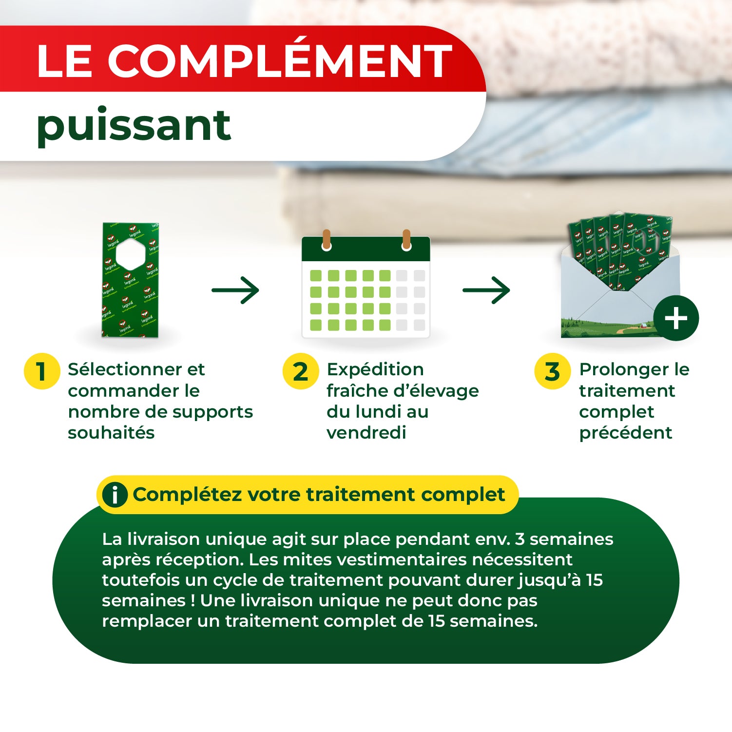 Vous avez déjà suivi le traitement de 15 semaines contre les mites textiles et vous voulez être sûr d’en avoir réellement fini avec ces parasites ? Aucun problème !