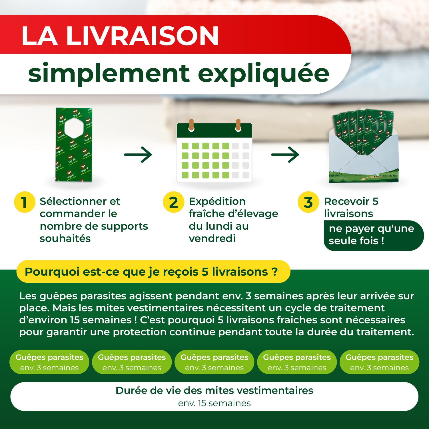 Le traitement est complété en 5 livraisons automatiques. Chaque colis contient des supports de trichogrammes fraîchement recueillis. Les trichogrammes contenus dans les 5 colis qui vous parviendront en 5 livraisons ont une différence de 3 semaines d’existence. Vous pouvez modifier vos dates de livraison avec une demande au préalable.
