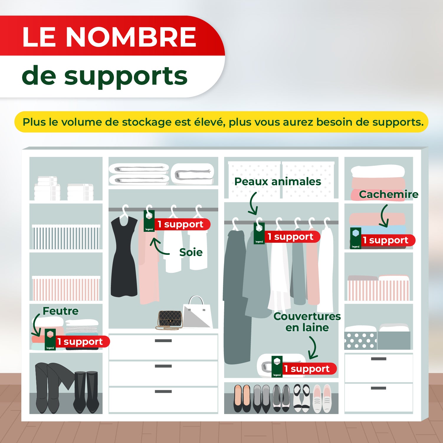Équipez chaque compartiment, étagère et tiroir d'au moins un support. Utilisez plus de supports dans les compartiments spacieux.