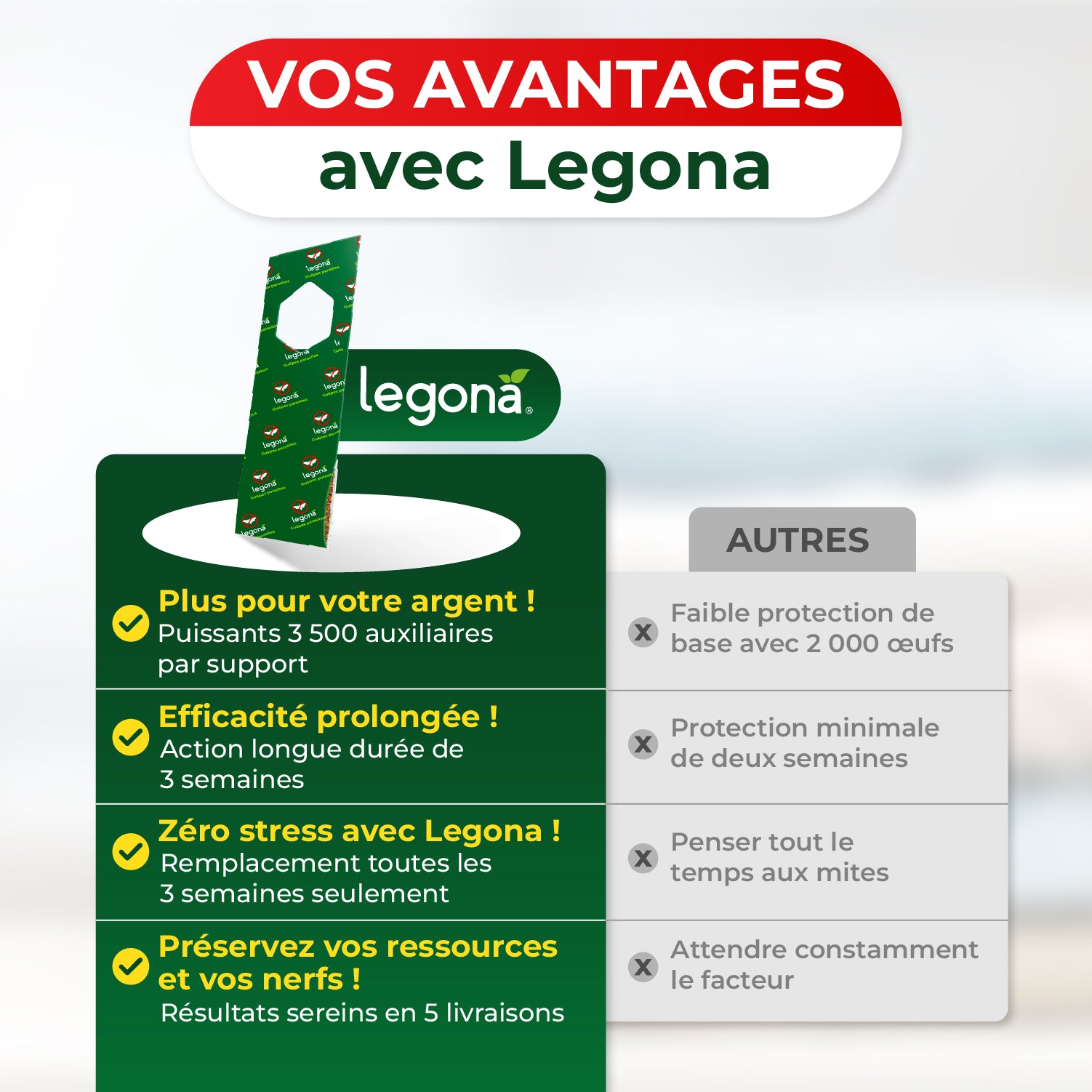 Les insectes utiles sont des organismes vivants peu stockables. Il est donc important de les utiliser immédiatement après réception. Merci de comprendre que les produits expédiés ne peuvent pas être repris. Plus d’informations sur l’annulation sont disponibles sur legona.fr/policies/refund-policy